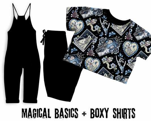 Kids + Adult Soft Goth + Witchy Manifest Black Bamboo Overalls. Tarot + Moons + Grimoire